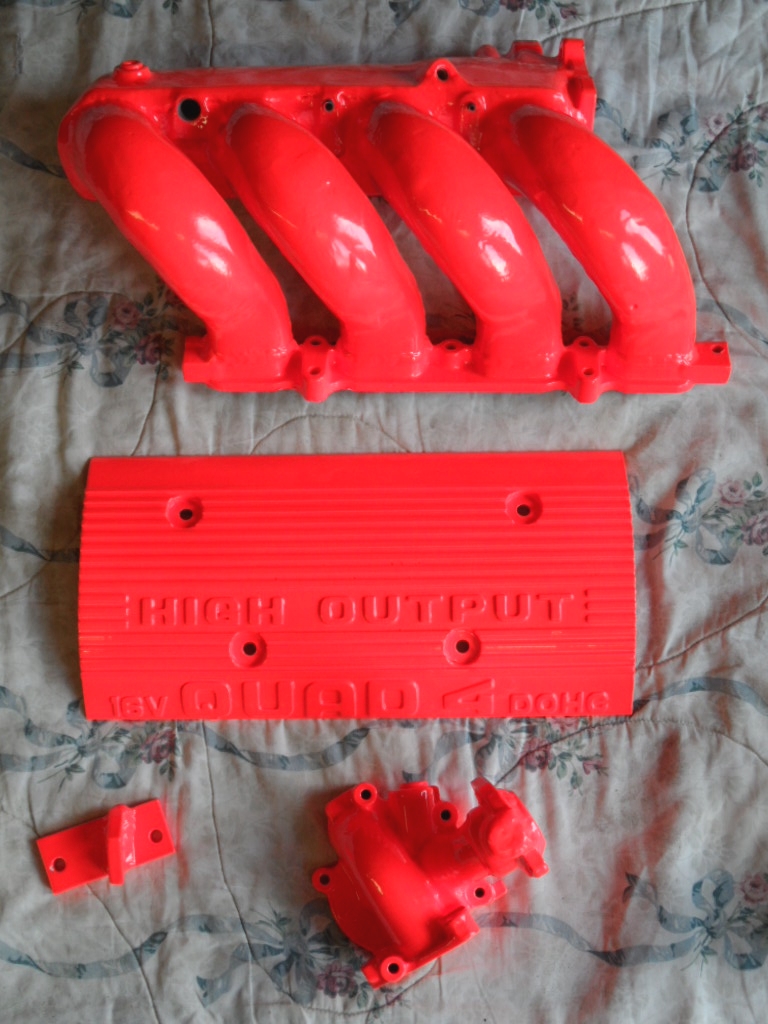 Coated engine covers, injector manifold, header, crank coupler, and torque tube assemby are waiting for the Quad 4 engine.